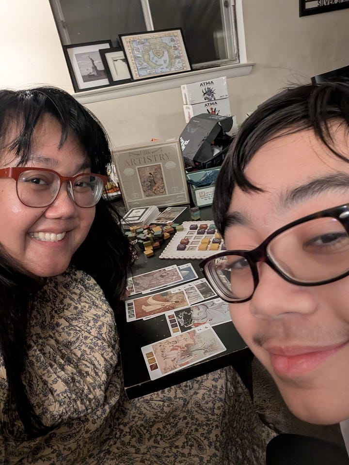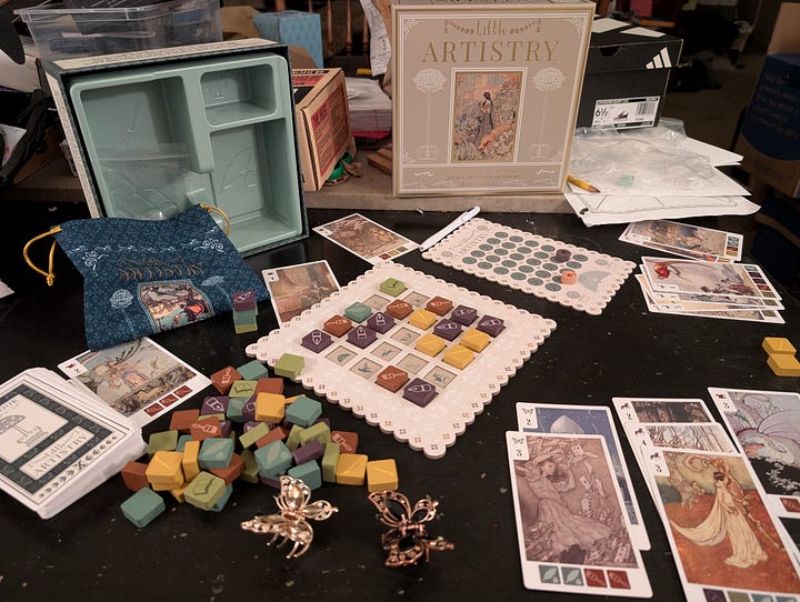 Little Artistry is the kid-friendly version of Dux Somnium’s Artistry, a gorgeous Art Nouveau-inspired board game. Having used many of the same public domain illustrations included here when designing my tabletop role-playing game Equinox, I was definitely interested in the theme! Little Artistry uses the conceit of gathering artisanal materials to buy fairy tale illustrations for points; whoever has the most points at the end is the winner. It isn’t as simple as the card games I usually play with my 11 year-olds (Uno and Alfabeto are big hits in our household) but Jms and I are optimistic that Little Artistry isn’t so rules-heavy that it will bore them either. He and I certainly had a fun time playing, especially since he won. His father walked past while we were setting up and said, “Better beat Mom before she figures out the rules and strategy and goes god-mode.” And then we all laughed, because it’s true.
